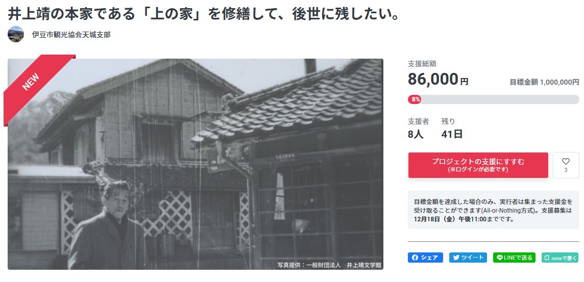 この修繕費確保のために伊豆市観光協会天城支部と井上靖ふるさと会は、修繕費の一部・100万円を目標にクラウドファンディングを「レディーフォー」で開始した。支援額に応じた返礼品も用意している。期間は11月6日から12月18日まで。